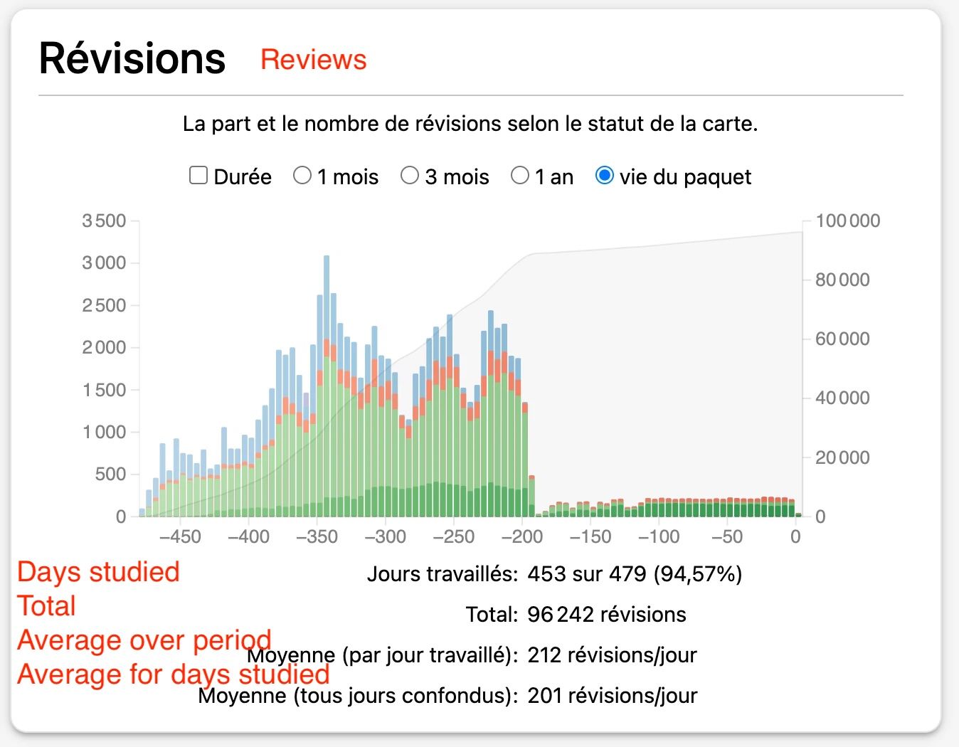 下图是每天的工作量,每个条形表示大约5天。因为备考的时间压力,我在学习的过程中没有设置每日工作量的上限,这造成了卡片越积越多,很多时候每天的复习任务需要一个多小时来完成。但实际上人每天能够学习的新东西是有限的,所以合理安排工作量以及设置上限是必要的。